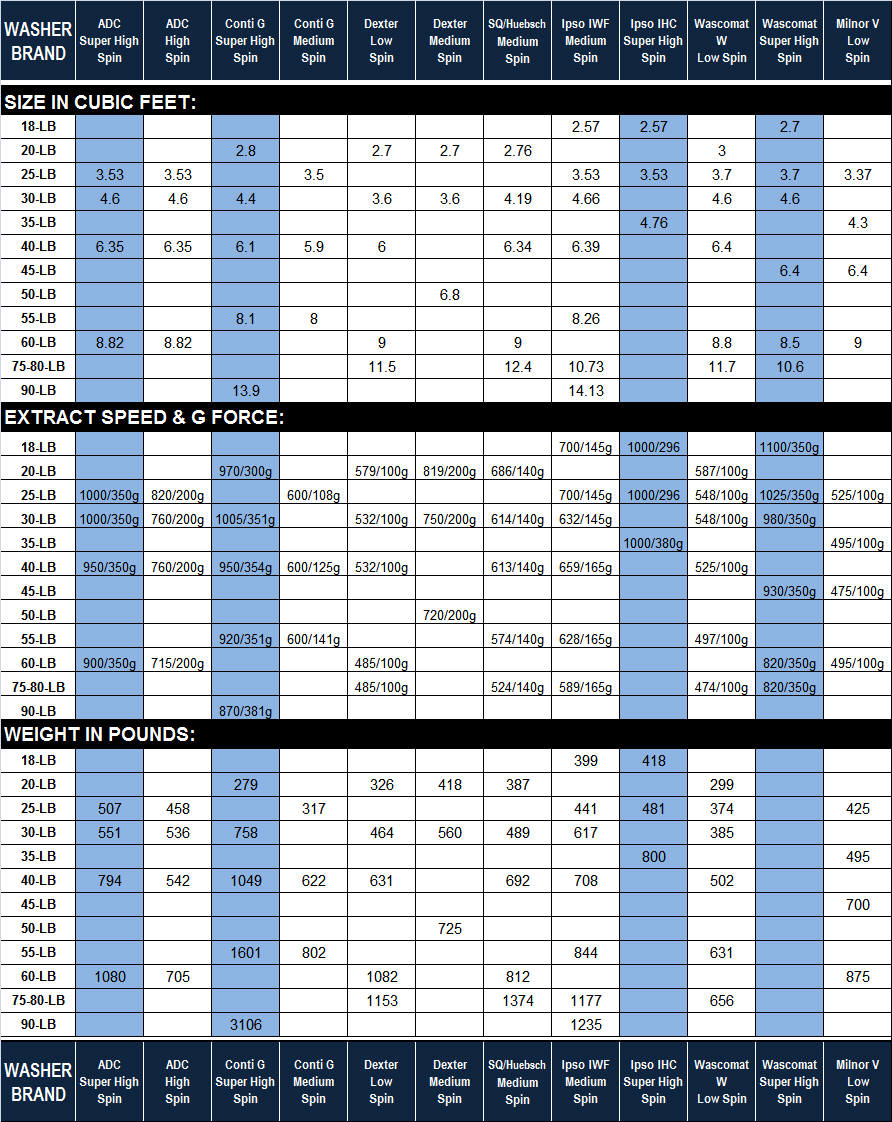 Use this chart to aid you in comparing three important features before you make an equipment purchase. I believe the most important feature is high speed followed by actual size in cubic feet and finally weight of the machine. Of course, there are other considerations including personal preference, price, reputation, dealer support, door size, appearance and repair support. Good hunting for the right machines for your Laundromat. Valid in 2015, update for latest models.